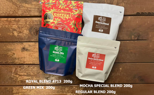 緑の館 / レギュラーブレンド・ロイヤルブレンド・グリーンミックス・モカスペシャルブレンド 豆 各 200g(計 800g)セット コーヒー コーヒー豆 珈琲豆 飲み比べ 珈琲 グリーンハウスコーヒー 下呂市