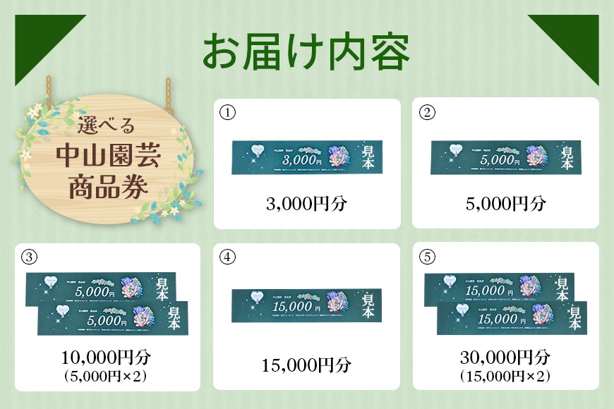 - 中山園芸 商品券 選べる 3,000円 5,000円 10,000円 15,000円 30,000円 ワークショップ 植物 園芸 関連商品 初心者 お子様 大人 歓迎 モルタルデコ 多肉植物 寄せ植え ギフト プレゼント 茨城県 那珂市 A07-022-SKU