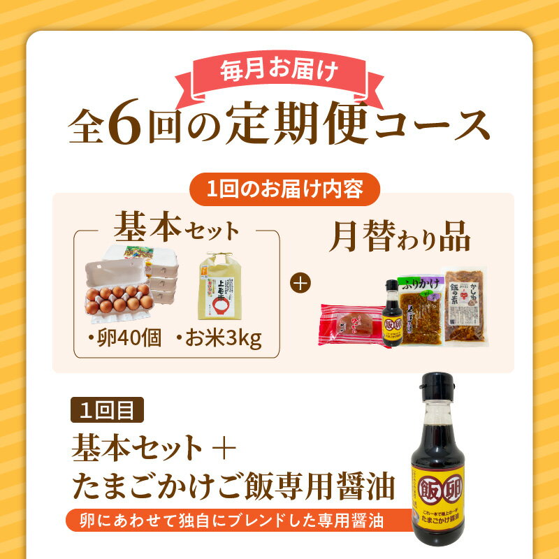 - 【ふるさと納税】定期便 6回 卵 40個 お米 米 精米 かぐやひめ 3kg 月替わり品 基本セット たまごかけご飯専用醤油 くぼて漬ふりかけ かしわめしの素 辛子明太子 都度精米 ご飯がすすむ 福岡県 上毛町 送料無料