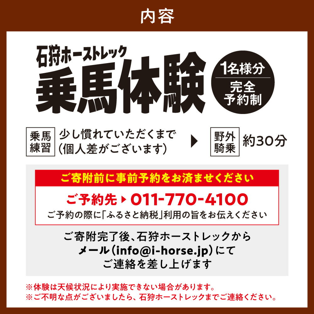 - 【ふるさと納税】 旅行 石狩ホーストレック 乗馬体験 < 完全予約制 > 乗馬 体験チケット 馬 ホーストレッキング レジャー アクティビティ チケット 観光 観光地応援 予約 体験 チケット 北海道 石狩 石狩ホーストレック 当別町