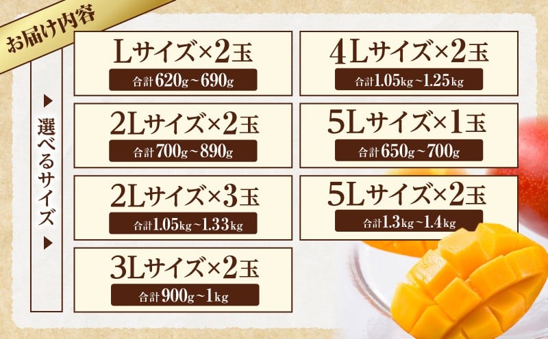 【ふるさと納税】【選べるサイズ】<宮崎県産 完熟マンゴー 4L×2玉(合計 約1kg)または3L×2玉(合計 約900g)または2L×2玉(合計 約700g)> ※2026年5月上旬~7月中旬までに順次出荷 果物 フルーツ マンゴー ギフト 贈答品 宮崎県 高鍋町【冷蔵】