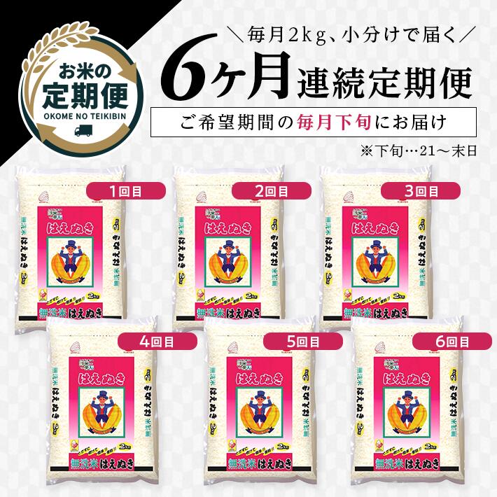 【ふるさと納税】≪6ヶ月定期便≫ 無洗米 はえぬき 2kg×6ヶ月連続 計12kg 山形県庄内産 毎月下旬にお届け 東北 山形県 遊佐町 庄内地方 庄内平野 庄内米 精米 白米 米 お米 ブランド米 ごはん ご飯 連続定期便 6回連続 小分け
