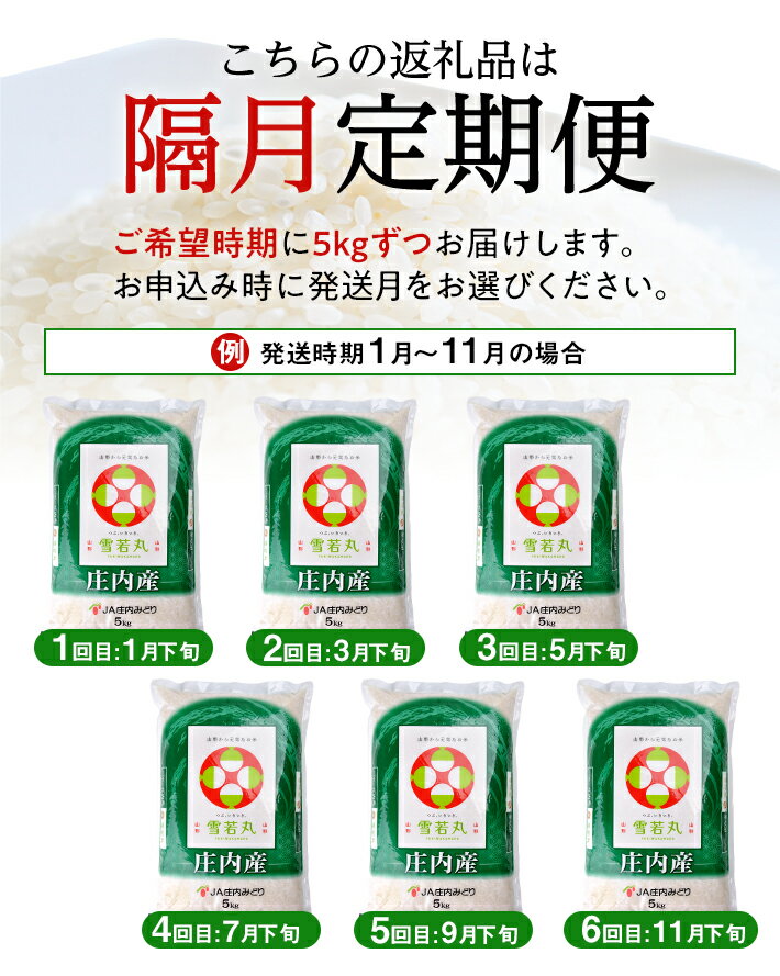 - 【ふるさと納税】≪隔月6回定期便≫ 雪若丸 5kg×6回 計30kg 山形県庄内産 隔月で下旬にお届け 東北 山形県 酒田市 庄内地方 米 精米 白米 お米 ごはん ご飯 庄内米 農協 JA 小分け 少人数 隔月 定期便