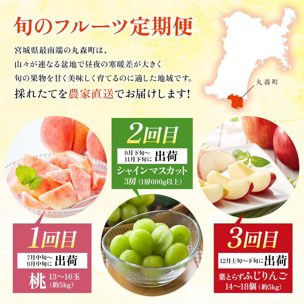 - 【ふるさと納税】【先行予約】《採れたてを農家直送》 宮城県丸森町産 フルーツ定期便 コース2 (桃・シャインマスカット・りんご) | 桃 13玉~16玉 5kg 1箱 シャインマスカット 600g以上 3房 ふじりんご 14~18個 5kg 宝ノ木果樹園 お取り寄せ 宮城県 丸森町 丸森【48008】