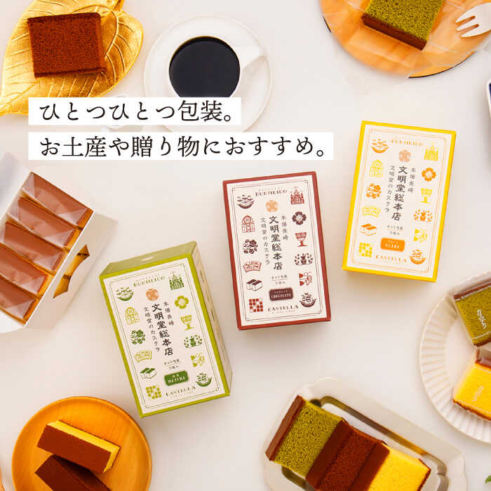 - 【ふるさと納税】【全6回定期便】 カット包装 カステラ 「プレーン・抹茶・チョコ」計24箱(4箱入×6回)【文明堂総本店】 [QAU013] 長崎 かすてら スイーツ 洋菓子お菓子 お土産 ギフト 贈り物 贈答 プレゼント おうち時間 甘い 食べ比べ お祝い 定期便
