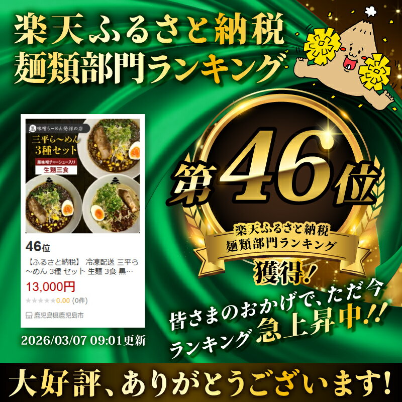 - 【ふるさと納税】 冷凍配送 三平ら~めん 3種 セット 生麺 3食 黒味噌チャーシュー入り ラーメン 焼き豚 チャーシュー スープ 味噌 黒味噌 とんこつ 豚骨 黒豚 元祖 自家製 辛味 冷凍 華 Ichi 三平ラーメン 鹿児島 鹿児島市 おすすめ ランキング プレゼント ギフト