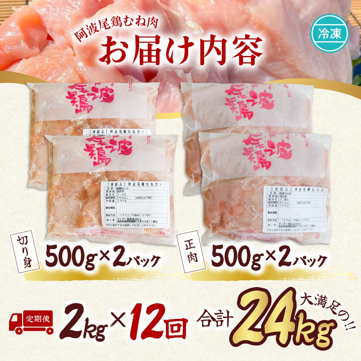 【阿波尾鶏のお肉定期便 12か月連続】阿波尾鶏むね肉2kg 12回お届け 12ヶ月定期便 阿波尾鶏 むね肉 約24kg (約2kg×12回) 冷凍 切り身 正肉 セット 徳島 地鶏 あわおどり