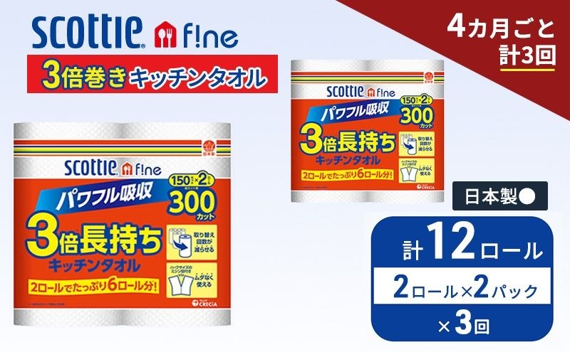 - 定期便 キッチンペーパー スコッティ 12ロール ファイン キッチンタオル 3倍巻き 150カット ペーパータオル 2ロール × 2パック《 4ヶ月ごと計3回 》