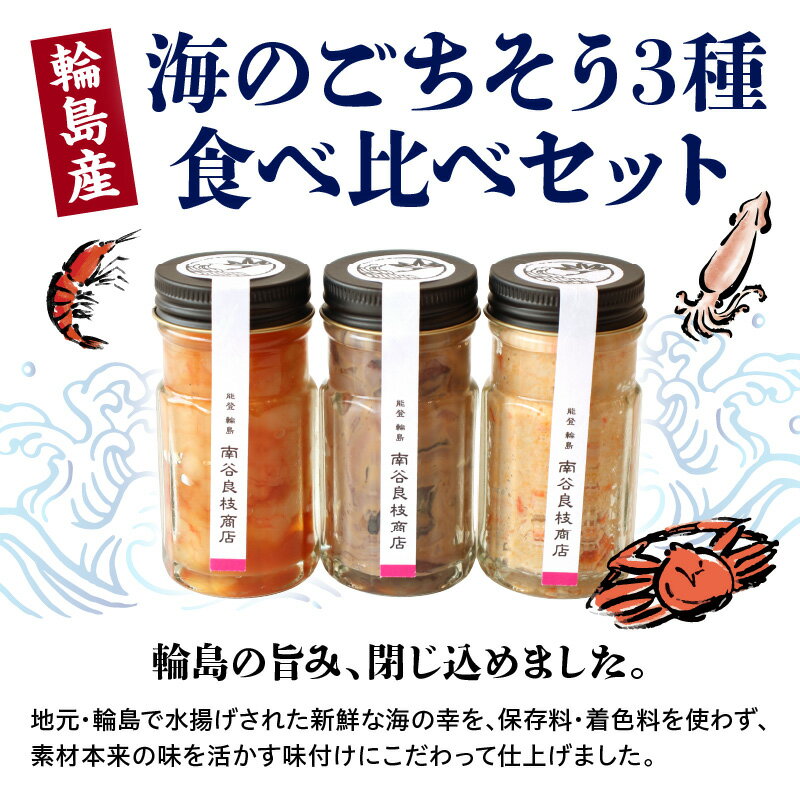 - 【ふるさと納税】海の ごちそう 3種 食べ比べ セット | 甘えび の 醤油漬け エビ 母ちゃんの 塩辛 イカ 紅ズワイ蟹 イタリアン かに カニ 60g×3 ご飯のお供 おつまみ 料理 冷凍 魚介類 魚介 海鮮 海の幸 水産加工品 加工品 国産 能登 石川県 輪島市