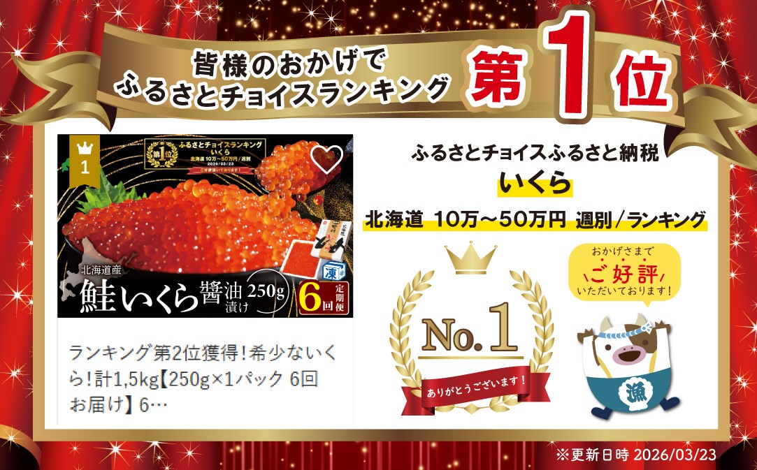 - 御礼!ランキング第1位獲得!希少ないくら!計1,5kg【250g×1パック 6回 お届け】 6ヵ月 定期便 漁協 直送!本場「北海道」 いくら 醤油漬け( 定期便 海鮮 いくら イクラ 醤油漬け 鮭 北海道 定期便 海鮮 定期便 海鮮 定期便 海鮮 定期便 海鮮 定期便 海鮮 ふるさとチョイス ふるさと納税 ランキング キャンペーン やり方 限度額 仕組み シミュレーション )