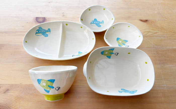 - 【瀬戸焼】子供用食器5点セット(飛行機・ロケット)贈答品対応【窯元SOUSEN】/食育 子育て ギフト [BBCQ011]