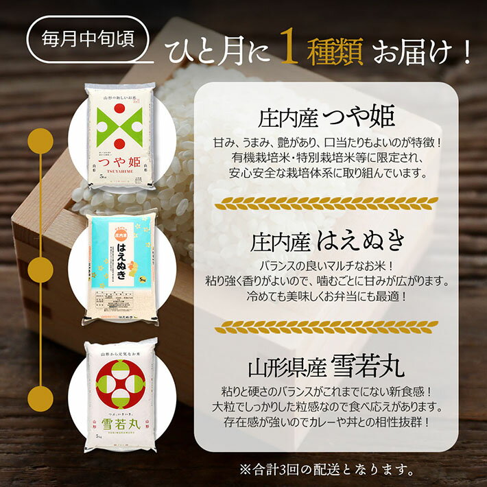 - 【ふるさと納税】【3か月定期便】山形のブランド米 食べ比べ 5kg×1袋 毎月1種 計15kg 選べる配送月 つや姫 はえぬき 雪若丸 ブランド米 米 国産 単一原料米 山形 庄内平野 コシヒカリの原点、亀の尾発祥の地 庄内 定期 ふるさと納税 米 定期便【毎月中旬発送】