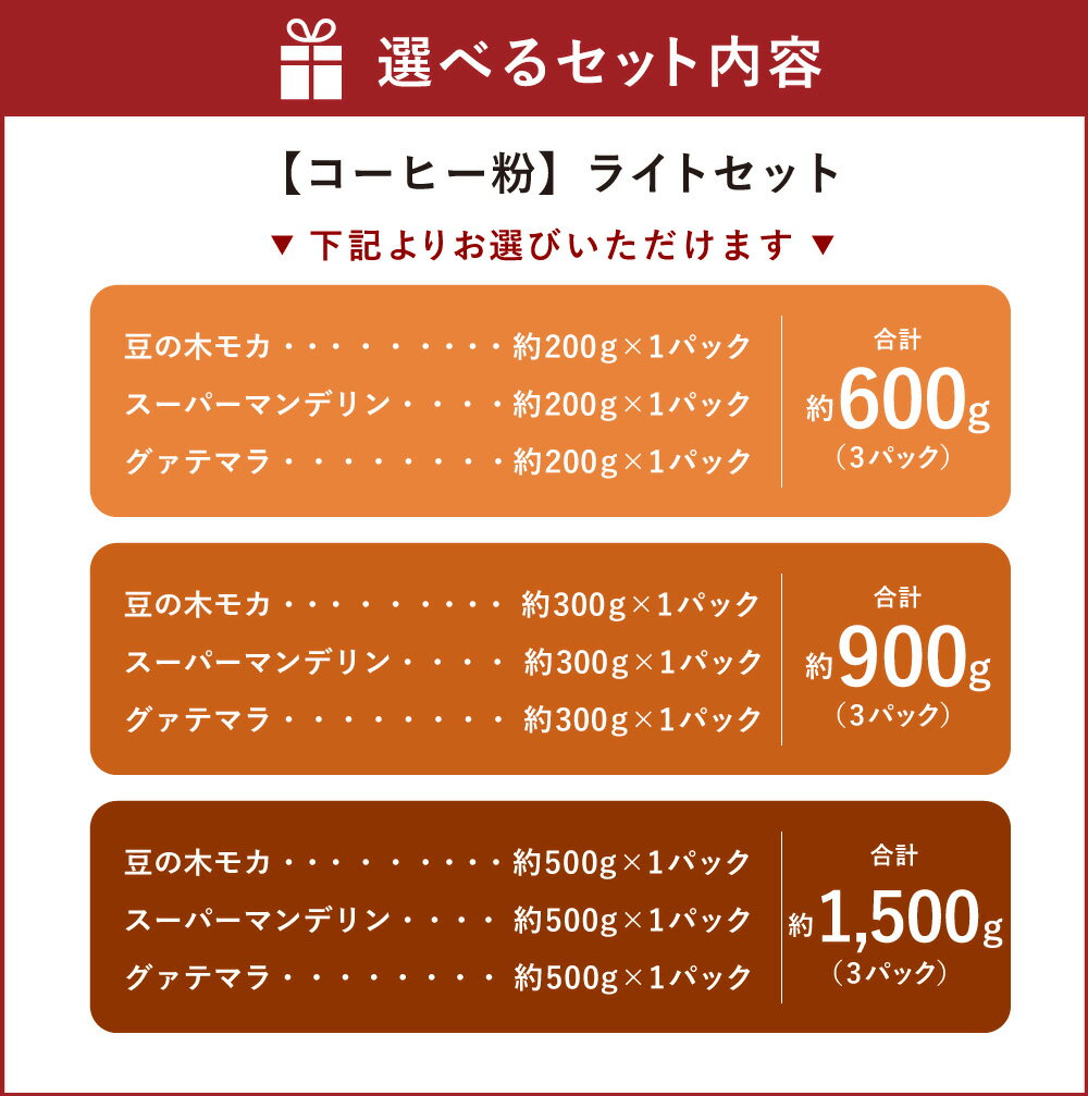 - 【ふるさと納税】<選べる内容量>【西荻窪】【コーヒー粉】ライトセット 3種 各1パック 計約600g(各約200g) / 計約900g(各約300g) / 計約1.5kg(各約500g) 豆の木モカ・スーパーマンデリン・グァテマラ コーヒー コーヒー粉 珈琲 珈琲粉 飲料 送料無料