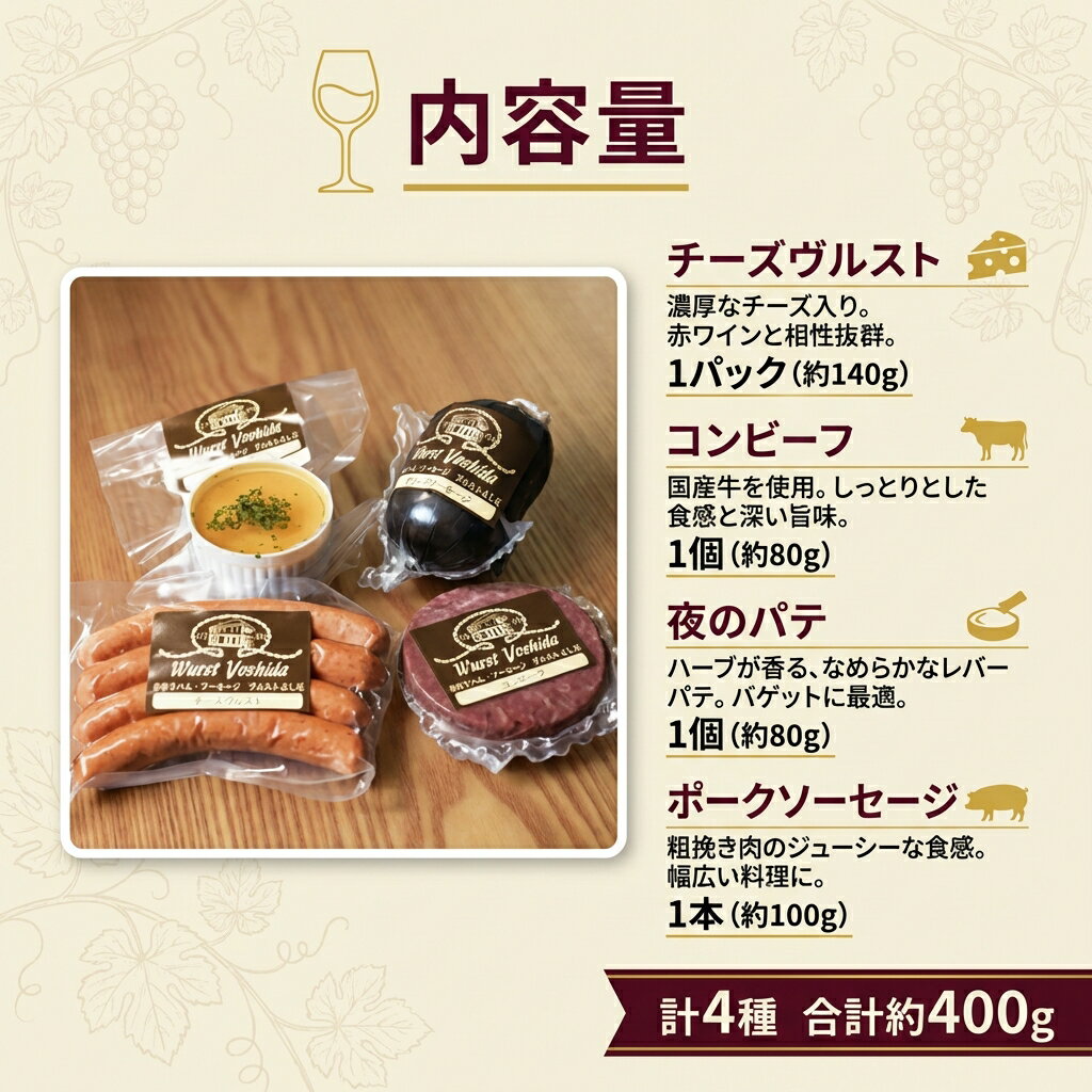 【ふるさと納税】ヴルストよしだ ワインに合う セレクト セット 4種 チーズヴルスト オリーブソーセージ コンビーフ 夜のパテ 計495g IFFA金賞 冷蔵 北海道 新十津川町 【新十津川町】