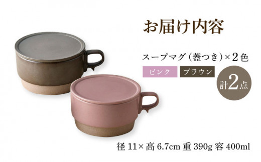 【波佐見焼】【オーブン可】スタッキング 蓋つき スープマグ 2点セット ピンク・プラウン マグカップ スープカップ 小皿 食器 皿 【舘山堂】 [RC46]