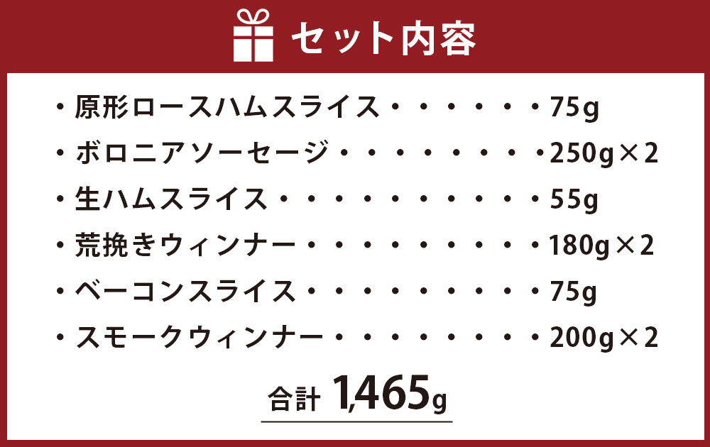 【ふるさと納税】九重“夢”ポーク ハム・ソーセージセットk 合計1465g ベーコンスライス 原形ロースハムスライス ボロニアソーセージ 生ハムスライス 荒挽きウインナー スモークウィンナー ギフト 国産 九州産 大分県産 冷蔵 送料無料