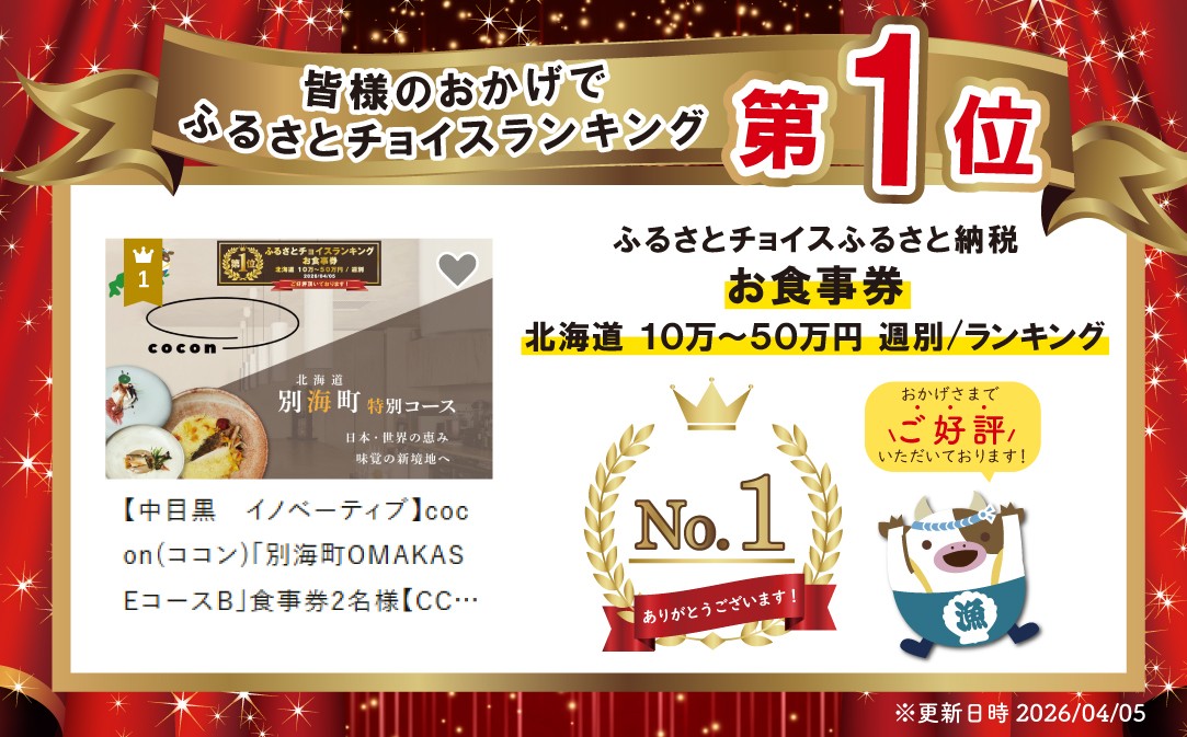 御礼!ランキング第1位獲得!【中目黒 イノベーティブ】cocon(ココン)「別海町OMAKASEコースB」食事券2名様【CC0000148】 ( ふるさと納税 レストラン ディナー ふるさと納税 レストラン ランチ コース料理 ふるさと納税 食事 ふるさと納税 食事券 東京 ふるさと 食事券 ふるさと 食事 ふるさと 食事券 東京 ふるさと納税 東京 食事券 ふるさと納税 チケット )