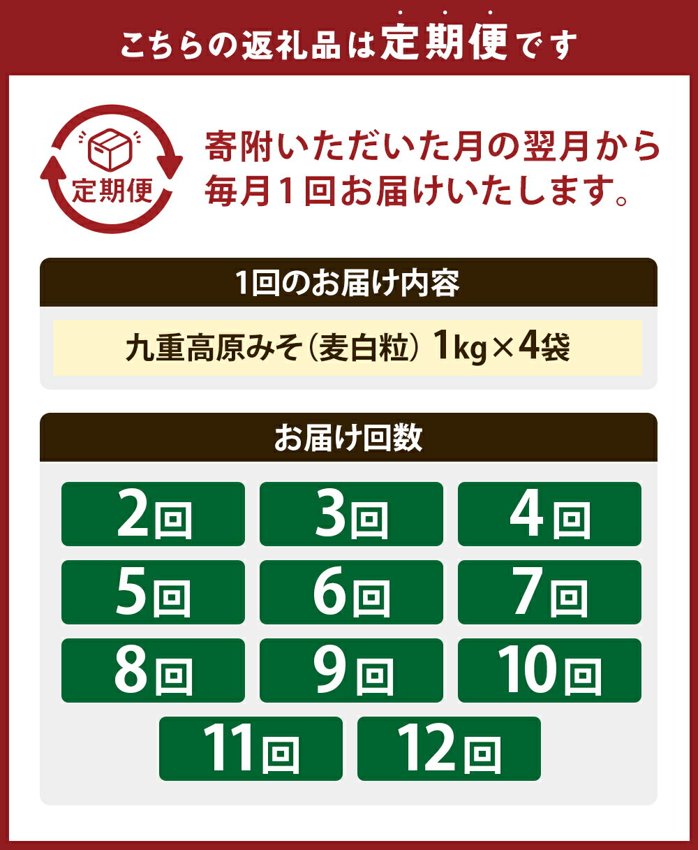 【ふるさと納税】<選べる定期便>九重高原みそ(麦白粒) 1回あたり計4kg(1kg×4袋) 1ヶ月毎 2回~12回 麦みそ 味噌 白色系 大麦 大豆 調味料 大分県産 九州 国産 大分県 九重町 送料無料
