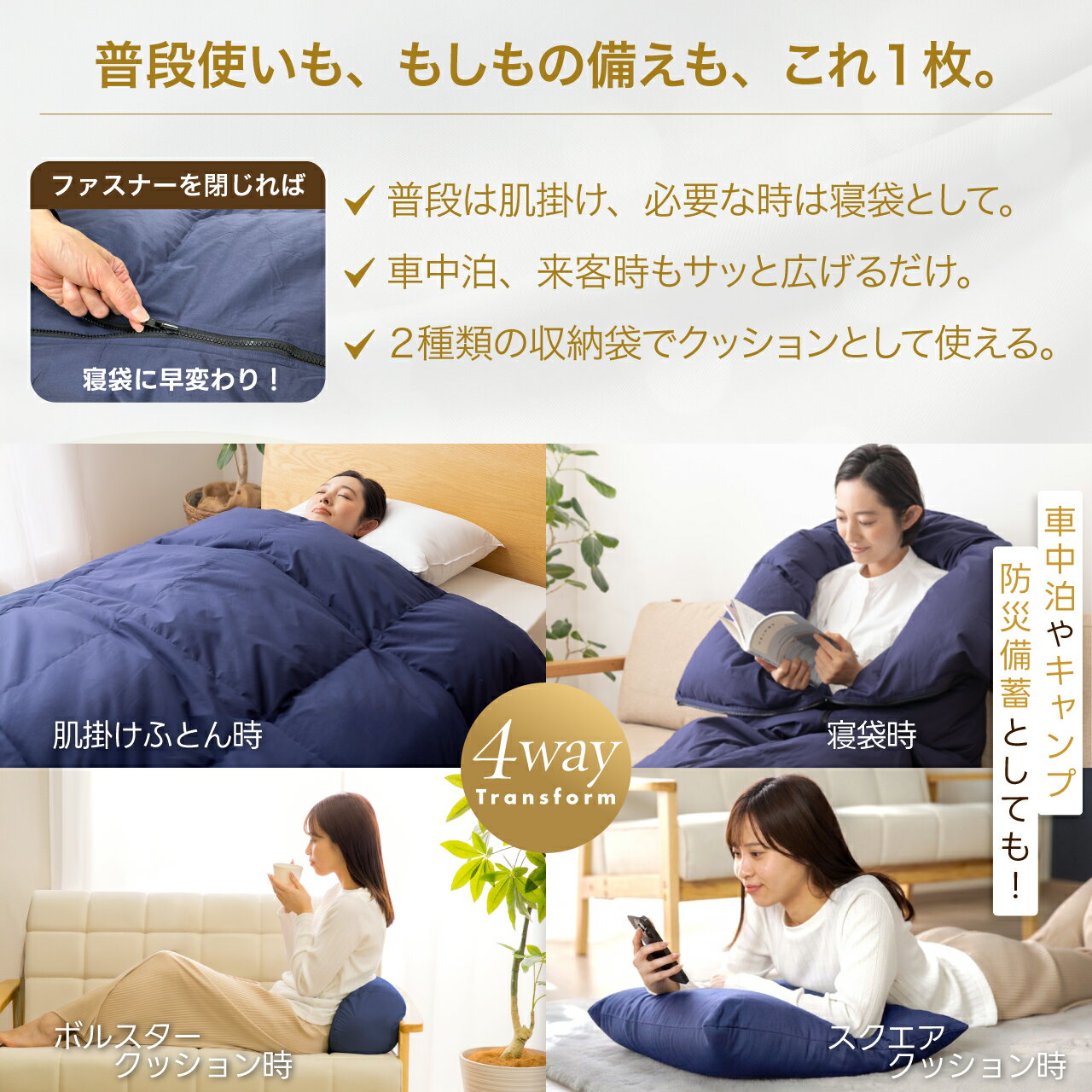 【ふるさと納税】 【寝袋4way!】寝袋 洗える 肌掛け ダウンケット 掛け布団 クッション コンパクト アウトドア オールシーズン 羽毛布団 ふとん シングル ダック85% 93% ネイビー ブラウン グレー 車中泊 防災 日本製 キャンプ シュラフ[川村羽毛 山梨県 韮崎市 20742857]