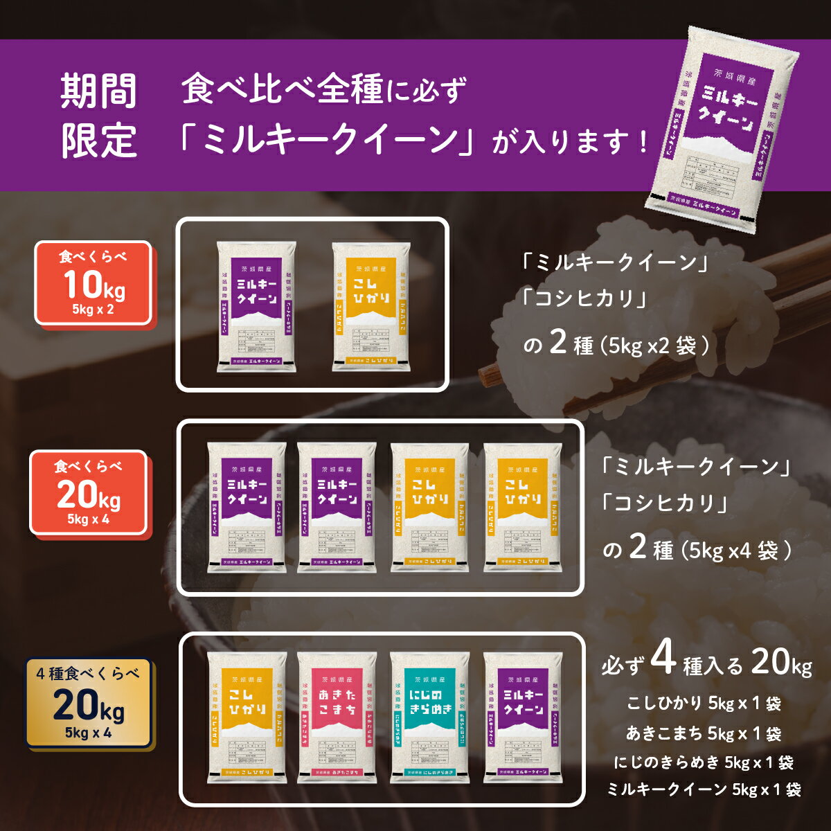 - 【ふるさと納税】精米 選べる品種・容量・発送月 令和7年産 5kg 10kg 20kg 1月 2月 3月 4月 5月 6月 食べ比べ コシヒカリ あきたこまち ミルキークイーン にじのきらめき 米 お米 白米 茨城県 八千代町 すぐ発送 すぐに届く スピード発送