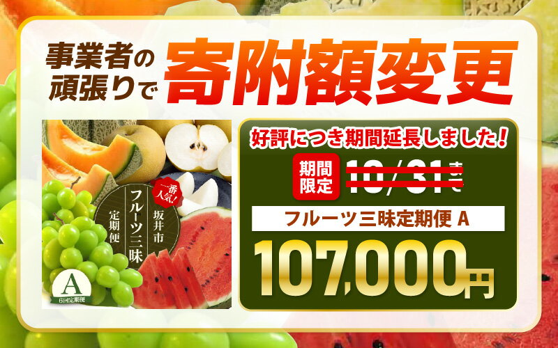 - 【ふるさと納税】【先行予約】 坂井市フルーツ三昧 !!定期便 2・3・6回【2026年6月上旬以降順次発送開始予定】 フルーツ定期便 果物 くだもの フルーツ デザート シャインマスカット メロン スイカ 食べ比べ 梨 10万円 新鮮 おすすめ お試し 旬のフルーツ定期便