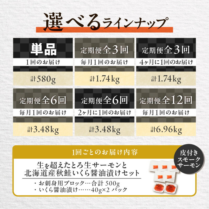 - 【ふるさと納税】<選べる回数> 王子サーモン 生を超えた とろ生サーモン と 北海道産 秋鮭 いくら醤油漬 セット 計580g 1回 or 定期便 サーモン 鮭 しゃけ トロ いくら 醤油漬け 魚卵 刺身 海鮮丼 丼 個包装 魚 北海道 苫小牧市 おすすめ ランキング プレゼント ギフト