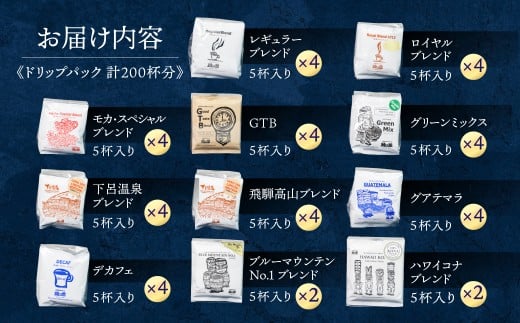 「緑の館」 / ドリップアソート 11種 計 200杯分 (ロイヤルブレンド、レギュラー、モカブレンド、GTB、グリーンミックス、下呂温泉ブレンド、飛騨高山ブレンド、グアテマラ、デカフェ、ブルーマウンテン、ハワイコナ)ドリップコーヒー ドリップ コーヒー 珈琲 下呂市 大容量 ドリップバック ドリップバッグ ドリップパック おすすめ