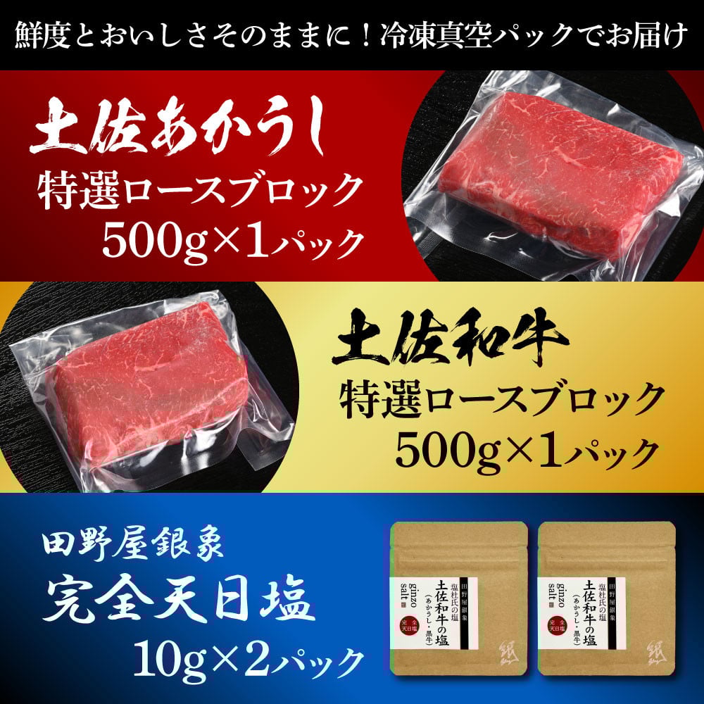 土佐あかうし&土佐和牛2種食べ比べ 特選ロースブロック500g 計2P 田野屋銀象完全天日塩2P付 牛肉 肉 お肉 和牛 国産 牛 赤身 ヒレ カルビ ロース【株式会社LATERAL】 [BQAU082]
