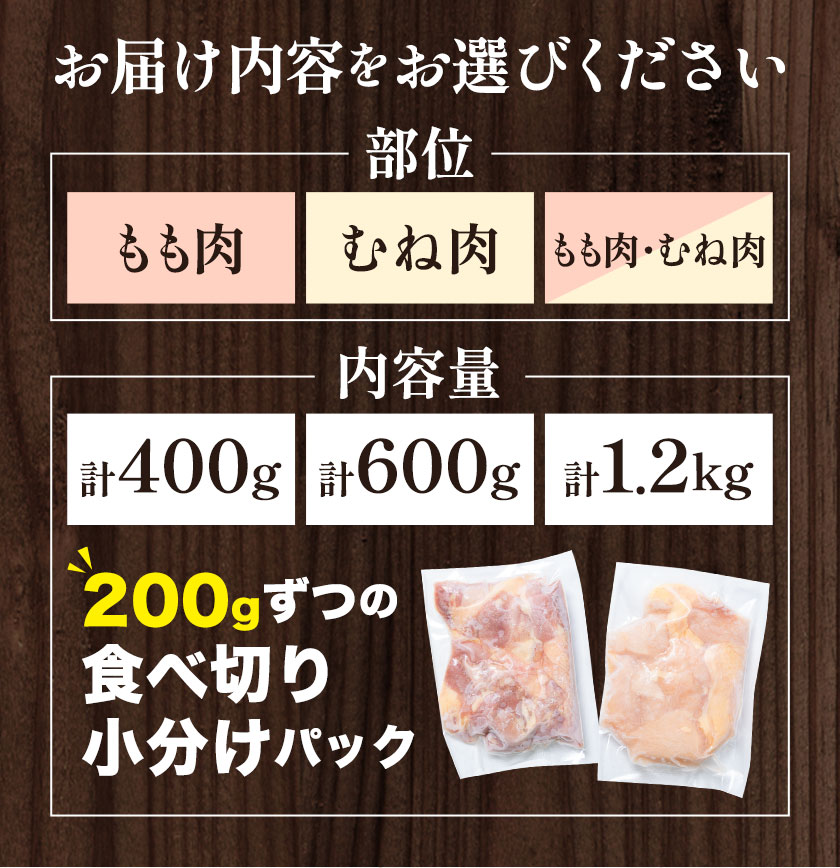 - 【ふるさと納税】親鳥 むね肉 もも肉 選べる容量 400g / 600g / 1.2kg ふるさと納税 小分け カット済 親どり おやどり ひね鳥 ひねどり 純鶏 じゅんけい もも モモ むね ムネ 鶏肉 鶏もも肉 とり肉 鶏むね肉 冷凍 高タンパク 焼肉 焼き鳥 煮物 炒め物 キャンプ おつまみ