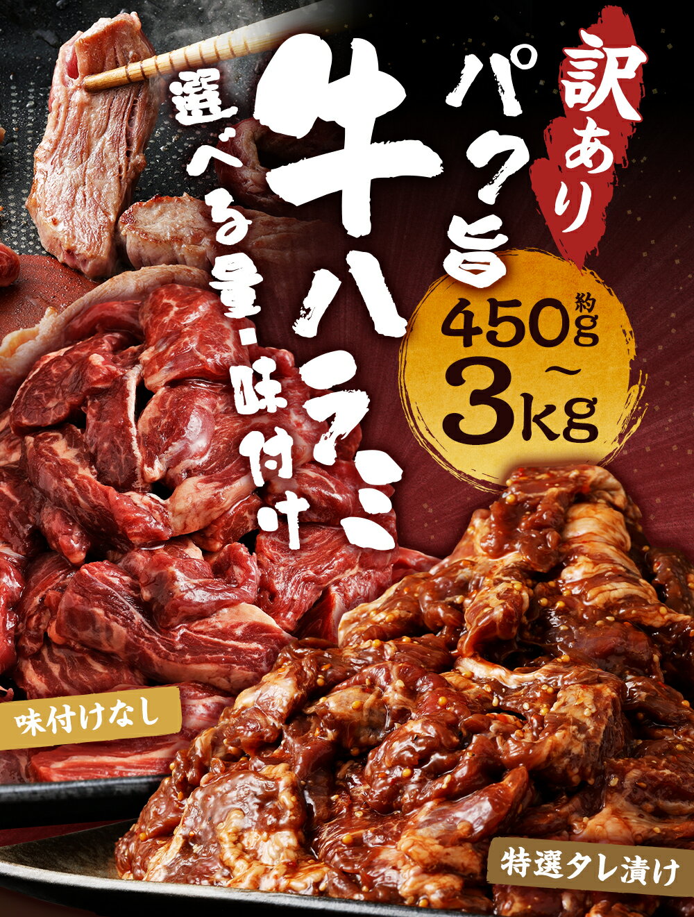 - 【ふるさと納税】【訳あり】パク旨牛ハラミ 特選タレ漬け or 味付けなし or 特選タレ漬け・味付けなし 計450g / 計900g / 計1.2kg / 計1.5kg / 計3kg 〈選べる!味と容量〉ハラミ 牛肉 お肉 タレ漬け 焼くだけ 簡単調理 個包装 不揃い 熊本県 熊本市 送料無料