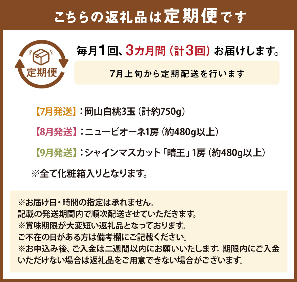 - 【ふるさと納税】【全3回定期便】岡山県産 フルーツ定期便 <お一人様向け> 岡山白桃 ニューピオーネ シャインマスカット 晴王 化粧箱入り もも モモ 桃 ぶどう ブドウ 葡萄 フルーツ くだもの 果物 果実 デザート 冷蔵 国産 送料無料 【2026年7月上旬~9月下旬迄発送予定】