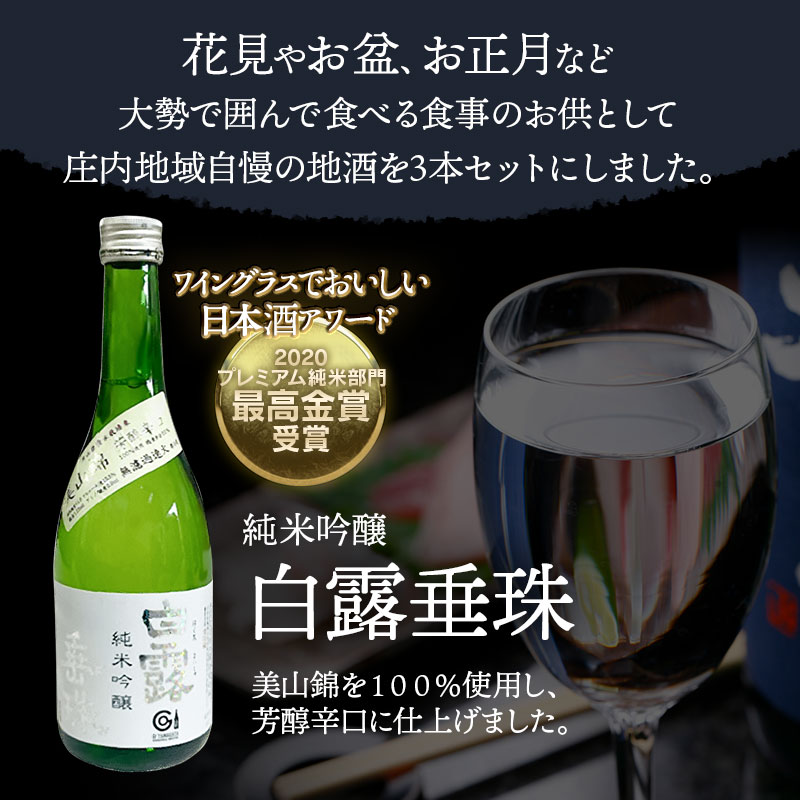 【ふるさと納税】肴のお供 地酒3本セット 各720ml×1本 山形県鶴岡市 庄内観光物産館事業部 | 純米吟醸 白露垂珠・特別純米酒 和田来・十水 お酒 日本酒 特別純米酒 地酒 アルコール 晩酌 日本酒セット 地酒セット セット 贈り物 贈答 ギフト お礼 山形県 鶴岡市 返礼品
