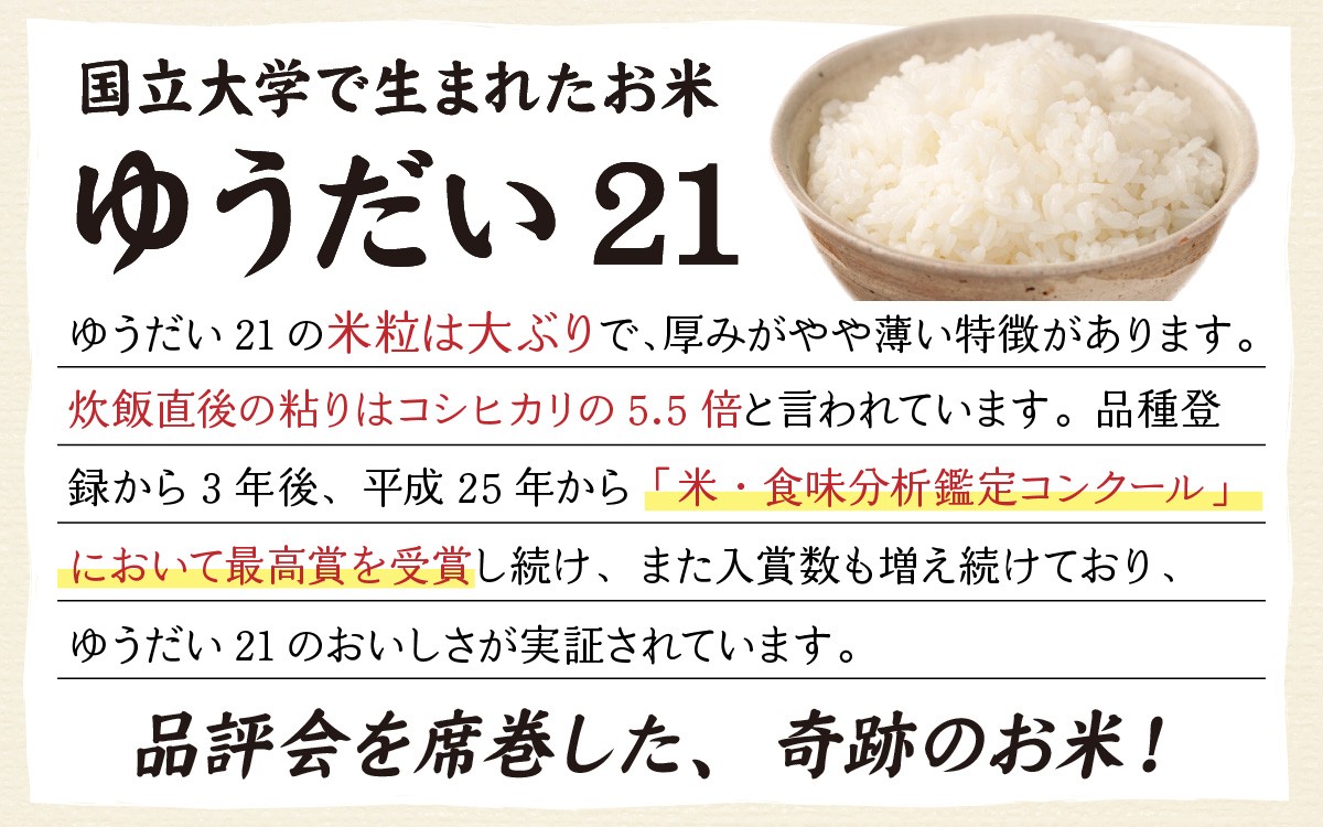 - 【先行予約】【令和8年産 新米】【選べるお届け回数】【農家直送】減農薬・化学肥料不使用 ゆうだい21 5kg×1袋(計5kg)【2026年10月より順次発送】 | お米 白米 ごはん ご飯 米 こめ 新米 ギフト プレゼント 内祝い 贈り物 国産 高品質 高級 南越前町 送料無料 福井 北陸