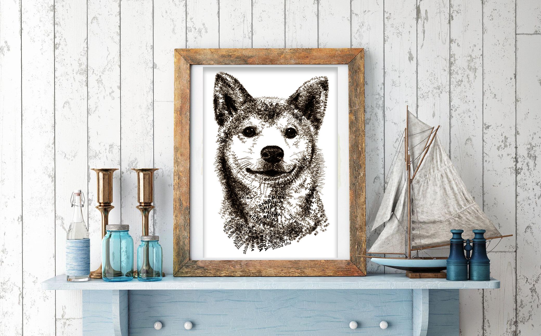 文字だけを使った絵画「文字ベースアート® (MojiBa®)」柴犬 A4サイズ