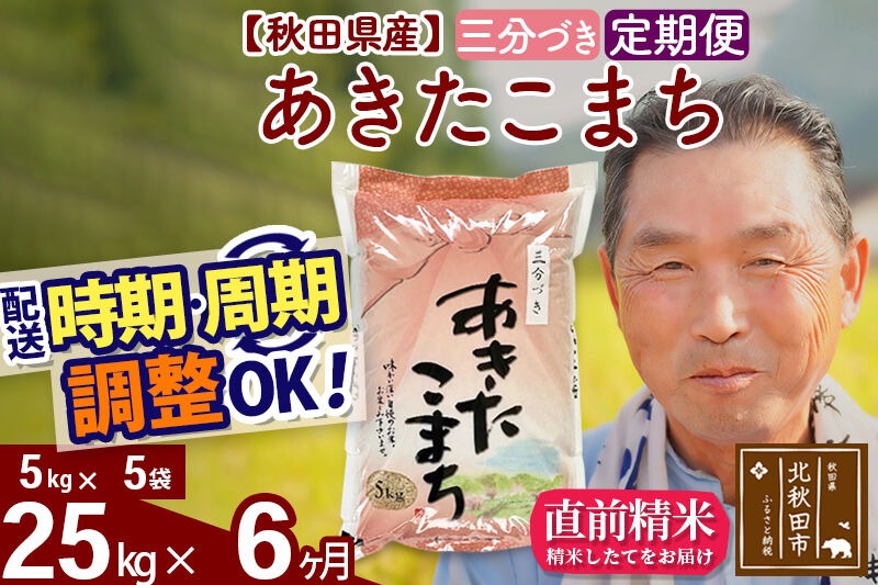 令和7年産《定期便6ヶ月》秋田県産 あきたこまち 25kg【3分づき】(5kg小分け袋) 2025年産 お届け時期選べる お届け周期調整可能 隔月に調整OK お米 おおもり [おおもり 秋田 お米 あきたこまち 米どころ 東北 北秋田市 定期便 毎月お届け]|oomr-50906