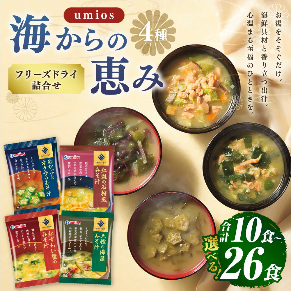 - 【ふるさと納税】<選べる内容量>Umios(ウミオス)海からの恵みフリーズドライ詰合せ 計10食 / 計16食 / 計26食 4種セット 紅鮭の石狩風・紅ずわい蟹・五種の海藻・めかぶとオクラ みそ汁 みそしる 味噌汁 お味噌汁 フリーズドライ 即席 レトルト 詰め合わせ 送料無料