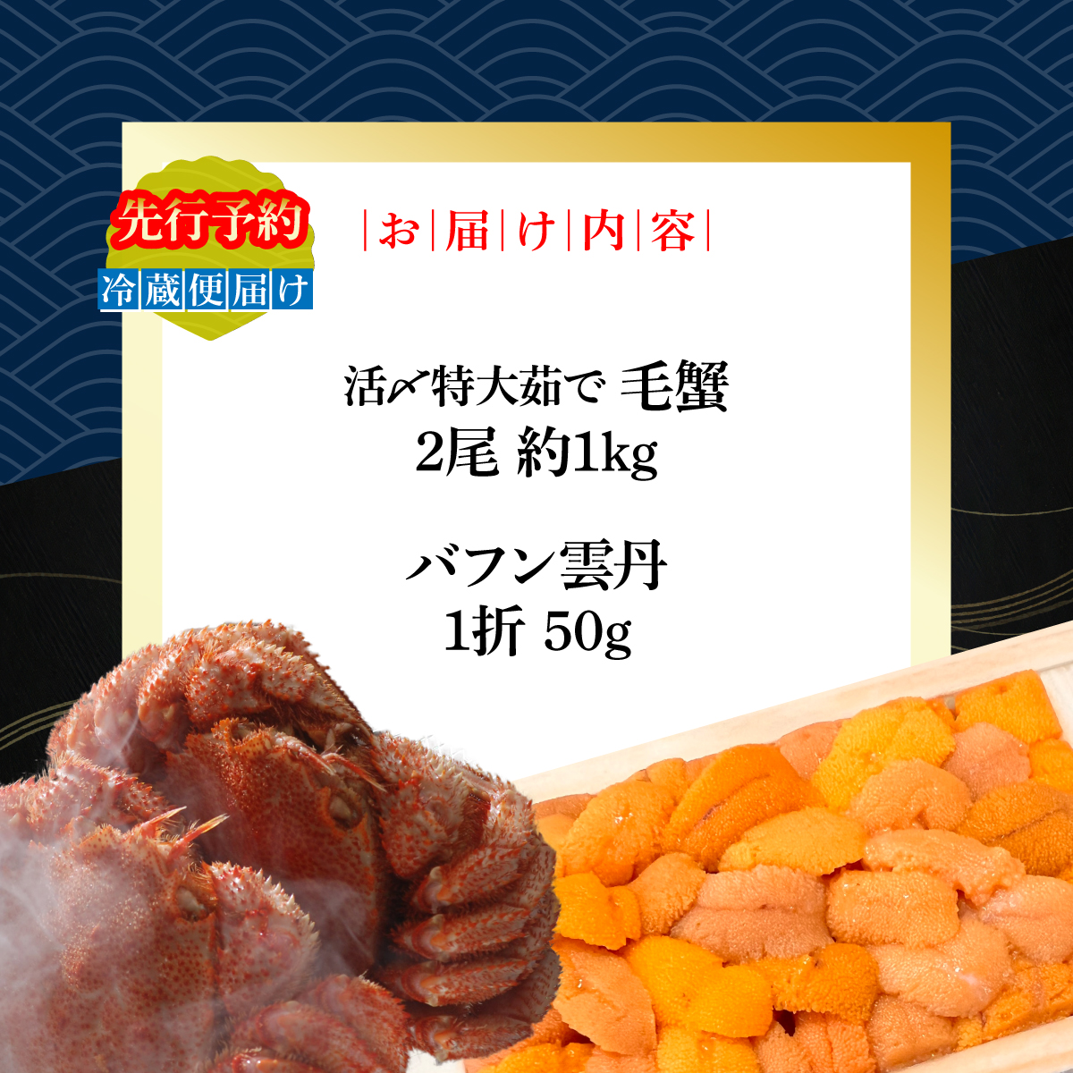 - 【先行予約】網走流氷海明けの活〆茹で毛蟹2尾で約1kgと網走産バフンウニ1折50gセット冷蔵便届け ABAO134