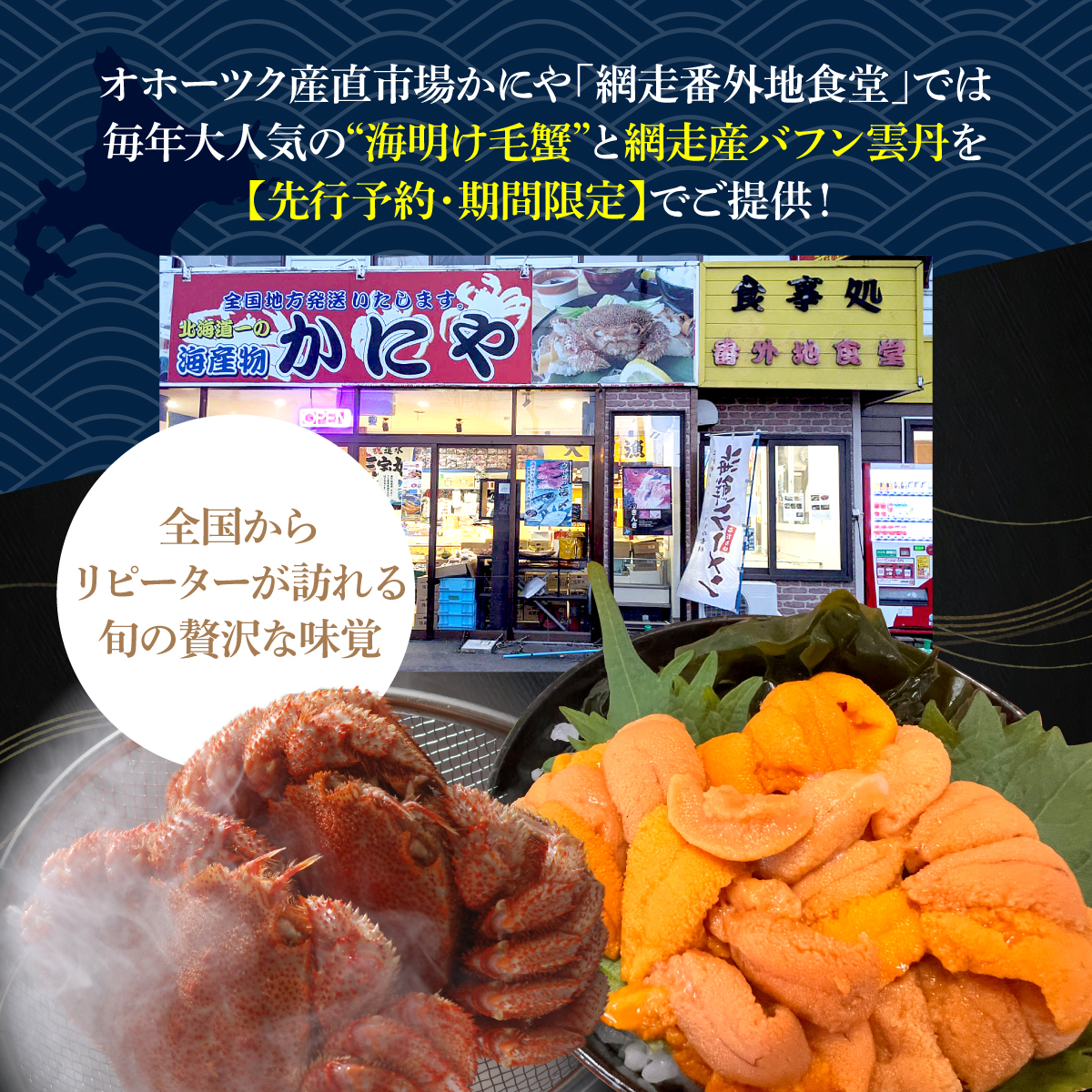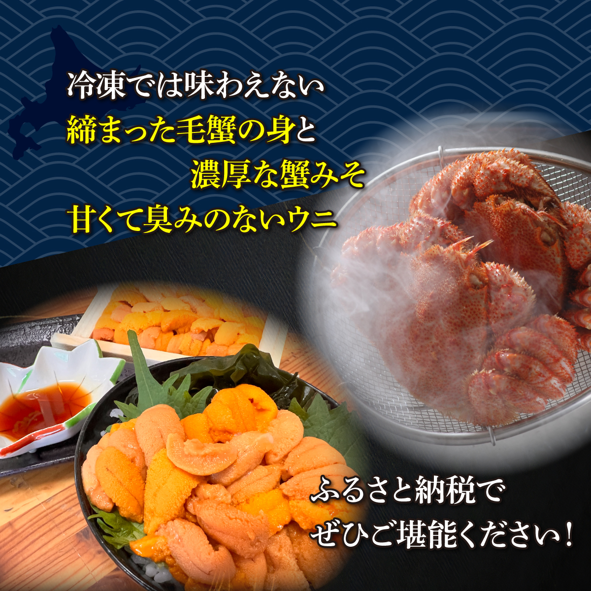 【先行予約】網走流氷海明けの活〆茹で毛蟹2尾で約1kgと網走産バフンウニ1折50gセット冷蔵便届け ABAO134