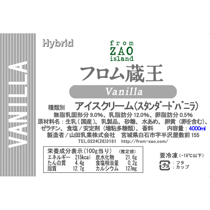 - 【業務用アイスクリーム】フロム蔵王 バニラアイスクリーム(リッチミルク)4000ml【01120】