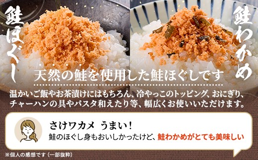 北海道産 天然 鮭ほぐし ( 100g × 3個 ) ・ 鮭わかめ ( 80g × 3個 ) セット 国産 無添加 鮭フレーク 瓶詰め 瓶詰 瓶 びん ほぐし さけほぐし さけわかめ さけワカメ サケワカメ 鮭 サケ さけ シャケフレーク しゃけふれーく フレーク ふれーく 魚介類 魚貝類 加工品 贈答用 贈答 お弁当 おにぎり パスタ お茶漬け ご飯 ごはん 北海道 標津町