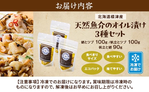 北海道産 天然 魚介 オイル漬け 3種 セット ( 帆立と蛸 ・ 帆立とツブ ・蛸とツブ ) 冷凍 パック 国産 おつまみ 肴 酒 お酒 パスタ サラダ 料理 帆立 ホタテ ほたて 蛸 タコ たこ ツブ つぶ ツブ貝 つぶ貝 貝 オイル オリーブオイル オリーブオイル漬け おつまみセット 食べきり サイズ 便利 小分けパック 新鮮 魚介類 魚貝類 北海道 標津町