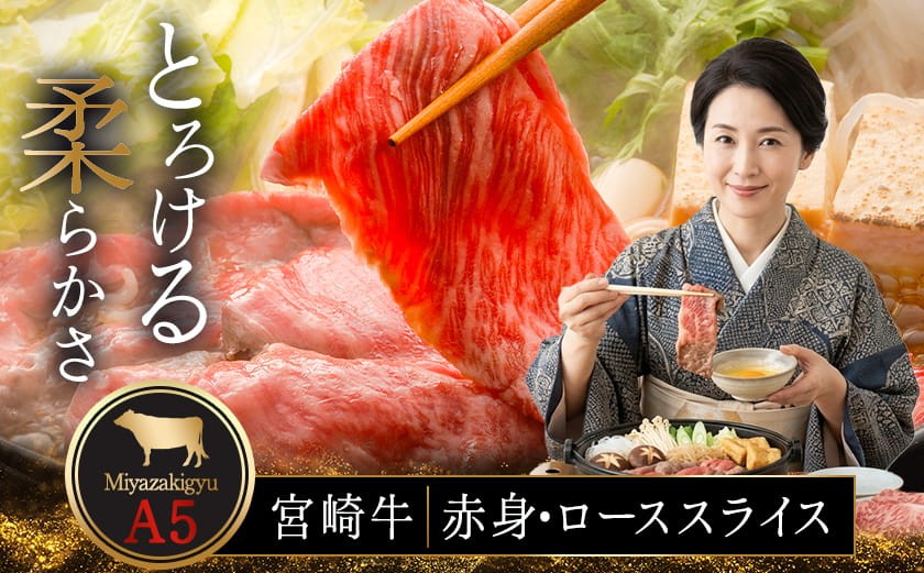 宮崎牛(A5)スライス食べ比べ600g≪みやこんじょ特急便≫_23-0102-Q_(都城市) すき焼き しゃぶしゃぶ 赤身スライス ローススライス A5 ギフト 贈答用 肉 A5 宮崎牛 冷凍