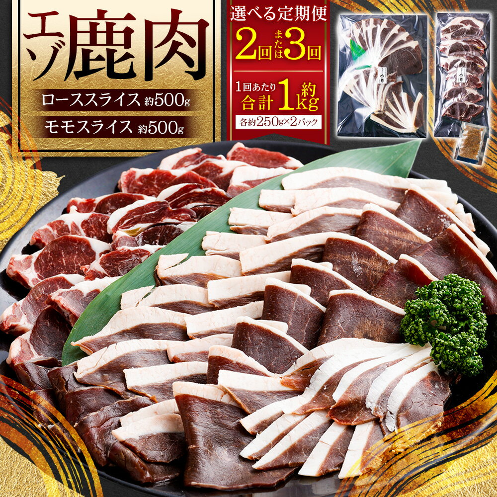 【ふるさと納税】<選べる定期便>エゾシカ 鹿肉 ローススライス モモスライス セット 1回あたり計約1kg(約250g×4パック(各2パック)) 1ヶ月毎 2回 3回 鹿肉 お肉 惣菜 おかず ごはんのお供 ご飯のお供 高タンパク質 低脂肪 ソテー ステーキ カツ 冷凍 送料無料