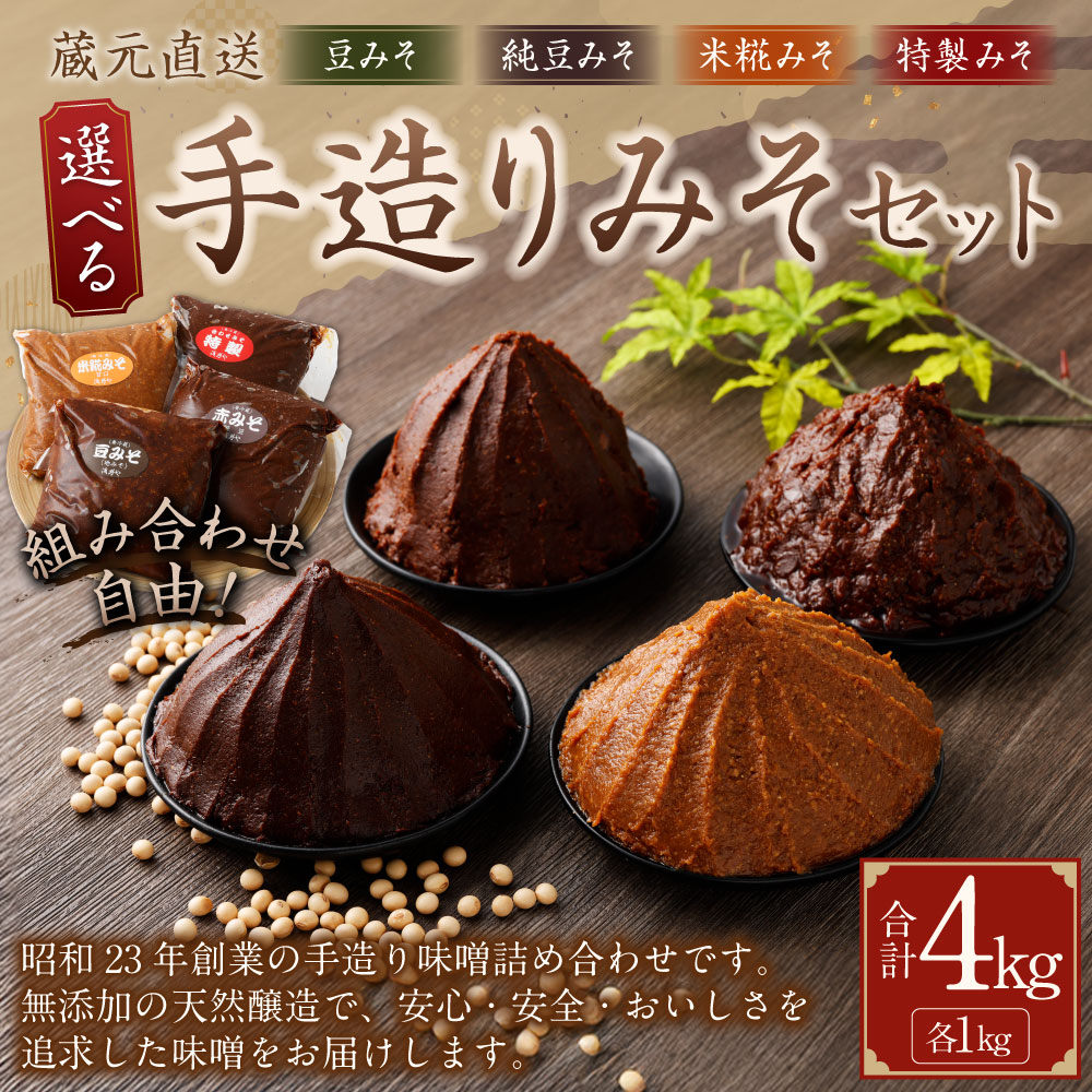 【ふるさと納税】蔵元直送 手造りみそ 選べるセット 計4kg(各1kg×4個) 豆みそ 純豆みそ 米糀みそ(甘口) 特製みそ みそ 味噌 地味噌 赤味噌 白みそ 合わせ味噌 調味料 漬物 味噌煮込みうどん 田楽みそ みそ汁 味噌汁 和え物 もつ鍋 キムチ鍋 味噌ラーメン おでん 冷蔵