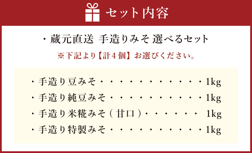 - 【ふるさと納税】蔵元直送 手造りみそ 選べるセット 計4kg(各1kg×4個) 豆みそ 純豆みそ 米糀みそ(甘口) 特製みそ みそ 味噌 地味噌 赤味噌 白みそ 合わせ味噌 調味料 漬物 味噌煮込みうどん 田楽みそ みそ汁 味噌汁 和え物 もつ鍋 キムチ鍋 味噌ラーメン おでん 冷蔵