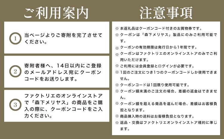 - ファッション ファクトリエのオンラインストアで使えるお買物券 3000円分 10000円分 20000円分 ライフスタイルアクセント株式会社 《30日以内に出荷予定(土日祝除く)》 和歌山県 紀の川市 コットン100% 選べる クーポンコード 森下メリヤス 服 送料無料