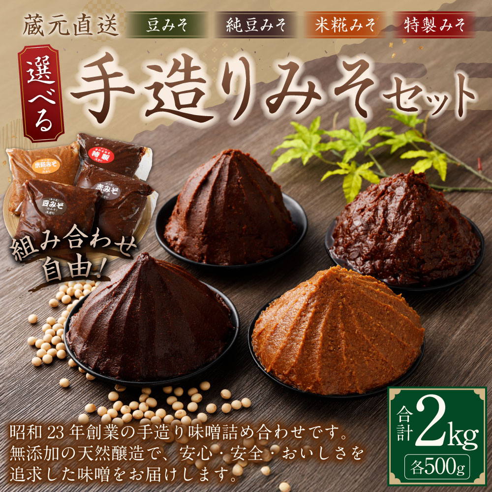 【ふるさと納税】蔵元直送 手造りみそ 選べるセット 計2kg(各500g×4個) 豆みそ 純豆みそ 米糀みそ(甘口) 特製みそ みそ 味噌 地味噌 赤味噌 白みそ 合わせ味噌 調味料 漬物 味噌煮込みうどん 田楽みそ みそ汁 味噌汁 和え物 もつ鍋 キムチ鍋 味噌ラーメン おでん 冷蔵