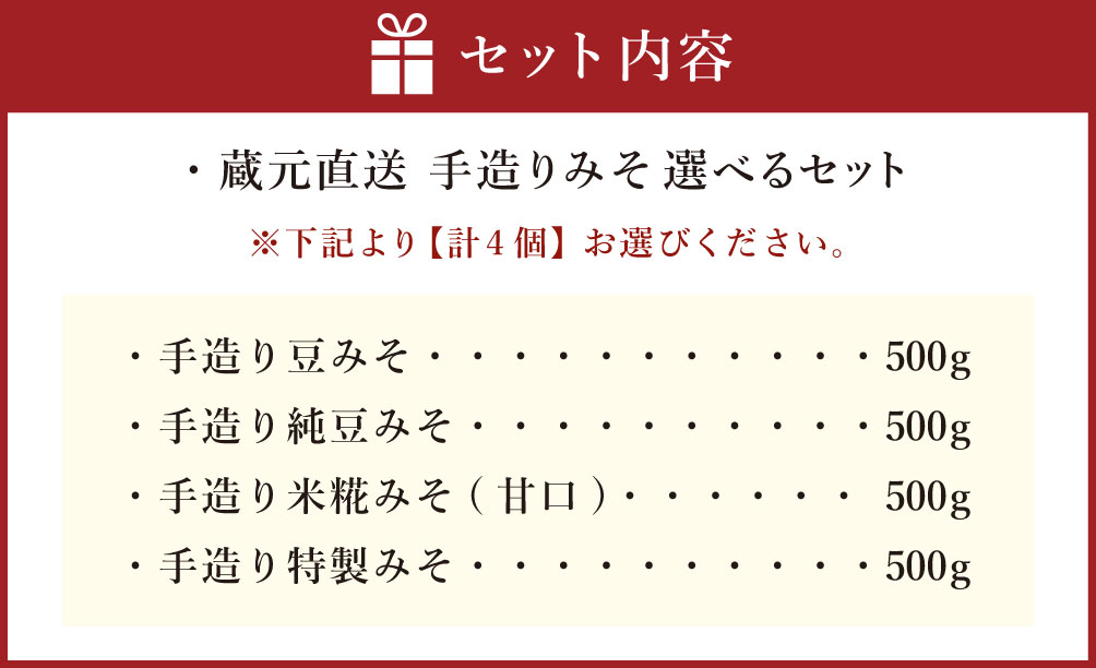 - 【ふるさと納税】蔵元直送 手造りみそ 選べるセット 計2kg(各500g×4個) 豆みそ 純豆みそ 米糀みそ(甘口) 特製みそ みそ 味噌 地味噌 赤味噌 白みそ 合わせ味噌 調味料 漬物 味噌煮込みうどん 田楽みそ みそ汁 味噌汁 和え物 もつ鍋 キムチ鍋 味噌ラーメン おでん 冷蔵