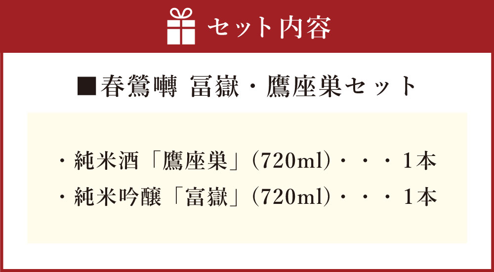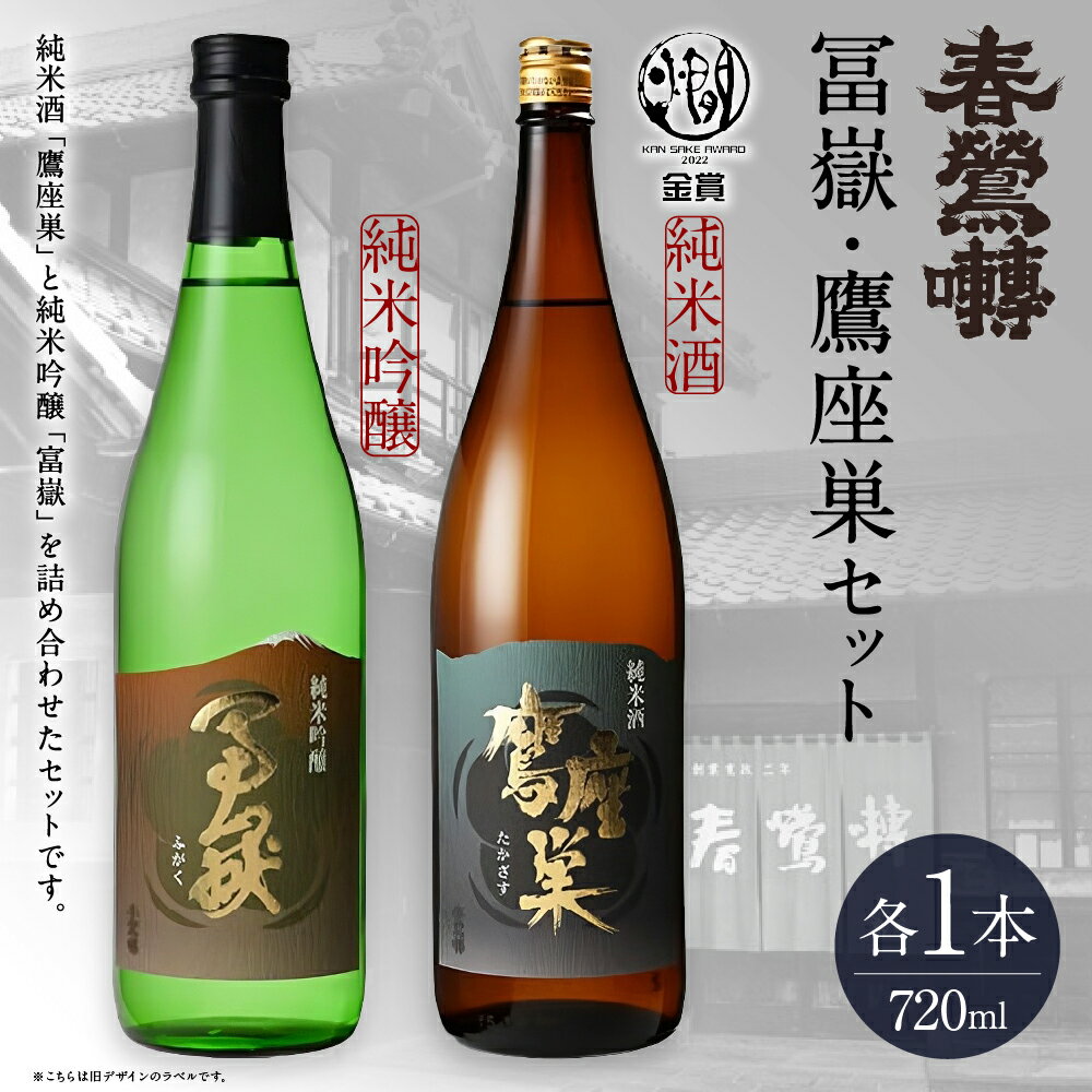 - 【ふるさと納税】冨嶽・鷹座巣セット 720ml×2本 純米酒「鷹座巣」・純米吟醸「富嶽」 各1本 玉栄 美山錦 お米 米麴 米こうじ 純米酒 純米吟醸酒 お酒 日本酒 飲料 国産 山梨県 中央市 送料無料