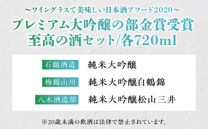 - 日本酒 ワイングラスで美味しい日本酒アワード2020〃プレミアム大吟醸の部金賞受賞酒 至高の酒セット / 純米大吟醸 720ml 日本酒 大吟醸 お酒 酒 おさけ さけ 地酒 金賞 受賞 愛媛 国産 ふるさと納税 お取り寄せ ギフト 飲み比べ プレミアム 四国 愛媛県 内子 返礼品 お礼 特産品 贈り物 ギフト人気 おすすめ 送料無料 【愛媛県酒造協同組合】 [BKAW003]